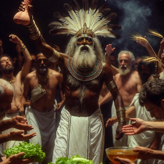 The UCC rite—celebrated either in a subterranean sanctuary or outdoors beneath a starry sky—is a living hymn to the phallic veneration of Min. At the center of the altar stands a statue or stylized symbol of the god: erect phallus gripped firmly in His hand, arm raised high, crowned with feathers evoking the solar disk. The faithful, gathered in a circle, offer fresh lettuce (the sacred plant for its seminal latex), honey, myrrh incense, and the first sheaf of wheat cut with a ritual sickle. Guru Eleazar Devananda, embodying the pharaoh-Horus-Min, leads the circular procession: slow dances, chants in ancient Egyptian and sacred languages, synchronized pranic breathing that activates the collective kundalini.